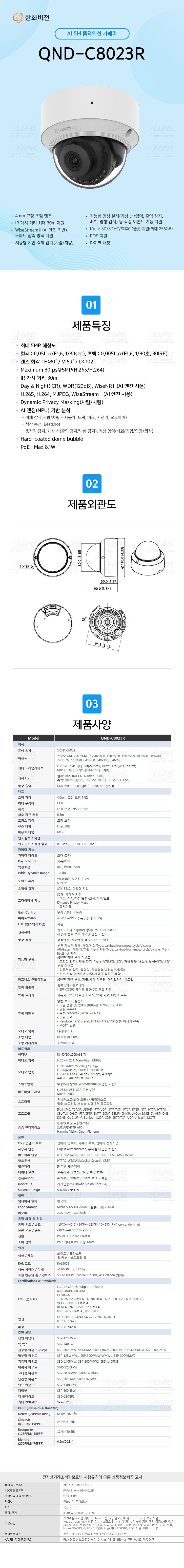 AI 5M µ¼Àû¿Ü¼± Ä«¸Þ¶ó, 4mm °íÁ¤ ÃÊÁ¡ ·»Áî, IR °¡½Ã °Å¸® ÃÖ´ë 30m Áö¿ø, WiseStream¥²(AI ¿£Áø ±â¹Ý) ½º¸¶Æ® ¾ÐÃà ¹æ½Ä Áö¿ø, Áö´ÉÇü ±â¹Ý °´Ã¼ °¨Áö(»ç¶÷/Â÷·®), Áö´ÉÇü ¿µ»ó ºÐ¼®(°¡»ó ¼±/¿µ¿ª, ÃâÀÔ °¨Áö, ¹èȸ, ¹æÇâ °¨Áö) µî °¢Á¾ À̺¥Æ® ±â´É Áö¿ø, Micro SD/SDHC/SDXC 1½½·Ô Áö¿ø(ÃÖ´ë 256GB), POE Áö¿ø, ¸¶ÀÌÅ© ³»Àå