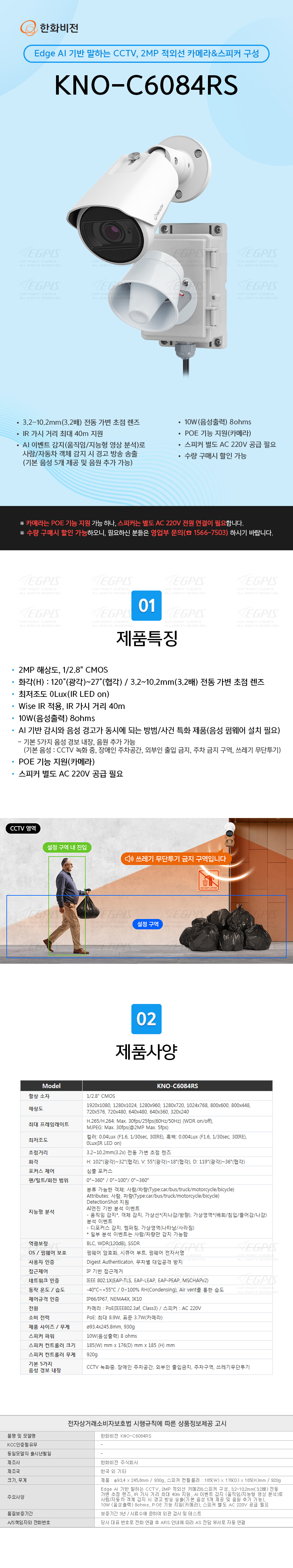 Edge AI ±â¹Ý ¸»ÇÏ´Â CCTV, 2MP Àû¿Ü¼± Ä«¸Þ¶ó&½ºÇÇÄ¿ ±¸¼º, 3.2~10.2mm(3.2¹è) Àüµ¿ °¡º¯ ÃÊÁ¡ ·»Áî, IR °¡½Ã °Å¸® ÃÖ´ë 40m Áö¿ø, AI À̺¥Æ® °¨Áö (¿òÁ÷ÀÓ/Áö´ÉÇü ¿µ»ó ºÐ¼®)·Î »ç¶÷/ÀÚµ¿Â÷ °´Ã¼ °¨Áö ½Ã °æ°í ¹æ¼Û ¼ÛÃâ(±âº» À½¼º 5°³ Á¦°ø ¹× À½¿ø Ãß°¡ °¡´É), 10W (À½¼ºÃâ·Â) 8ohms, POE ±â´É Áö¿ø(Ä«¸Þ¶ó), ½ºÇÇÄ¿ º°µµ AC 220V °ø±Þ ÇÊ¿ä, ¼ö·® ±¸¸Å½Ã ÇÒÀÎ °¡´É