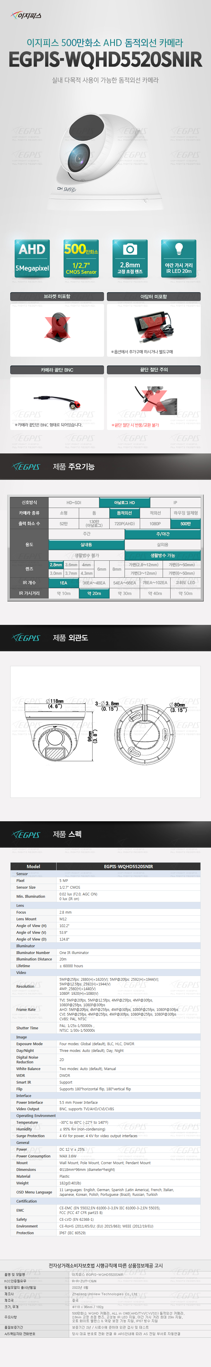 500¸¸È­¼Ò WQHD Ä«¸Þ¶ó, ALL in ONE(AHD/TVI/CVI/SD) µ¼Àû¿Ü¼± Ä«¸Þ¶ó, 2.8mm °íÁ¤ ÃÊÁ¡ ·»Áî, °í¼º´É IR LED Áö¿ø, ¾ß°£ °¡½Ã °Å¸® ÃÖ´ë 20m Áö¿ø, ¿ÀÅä È­ÀÌÆ® ¹ë·±½º & ¿ª±¤ º¸Á¤ ±â´É Áö¿ø, IP67 ¹æ¼ö Áö¿ø